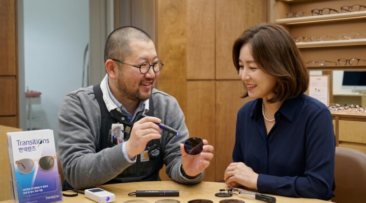 사이트안경에서의 첫 상담은 제 생활패턴에 대한 질문으로 시작되었습니다. 야외활동 빈도, 주로 활동하는 시간대, 운전 여부, 실내 조명 환경까지 꼼꼼하게 체크해주셨어요. 단순히 “변색 렌즈 드릴까요?”가 아니라, 제 눈이 어떤 환경에서 가장 스트레스를 받는지를 먼저 파악하는 과정이 인상적이었습니다.